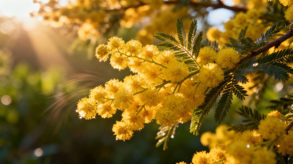 とても良い質問です。実は、私たちが普段「ミモザ」と呼んで親しんでいる花の多くは、植物学的には「アカシア属」に分類されるものです(例:フサアカシア、ギンヨウアカシア)。本来の「ミモザ」はオジギソウ(Mimosa pudica)を指す言葉でした。しかし、現在ではアカシアの花がミモザとして完全に定着しているため、花言葉もアカシアの花言葉と同じものとして扱われるのが一般的です。