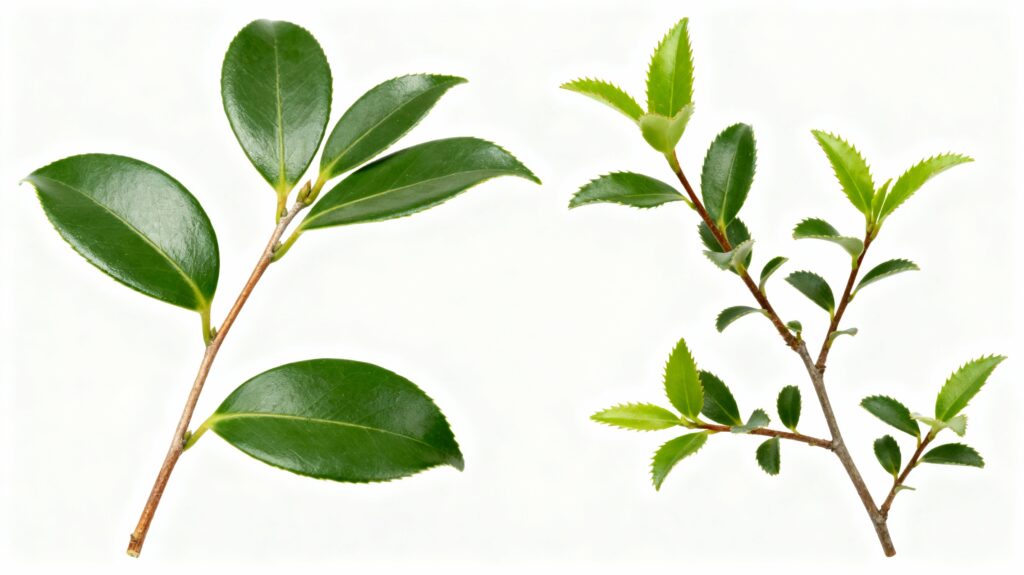 この二つを見分けるための最も分かりやすく、確実なポイントは「葉の縁(ふち)の形」です。榊(本榊)の葉は、縁全体が滑らかでギザギザがなく、つるりとしているのが最大の特徴です。それに対して、ヒサカキの葉は、榊より一回り小さいことが多く、葉の縁に細かいノコギリの歯のようなギザギザ(専門用語で「鋸歯(きょし)」と言います)があるのが特徴です。葉を一枚手に取って、指先で縁をそっとなぞってみると、その違いがはっきりと分かります。現在では、スーパーや花屋で「神棚用の榊」として販売されているものの中には、このヒサカキがかなりの割合で含まれています。どちらをお供えしても神様に対して失礼にあたるということはありませんが、本来の「榊」とは異なる植物であるという点は、豆知識として知っておくと良いでしょう。
